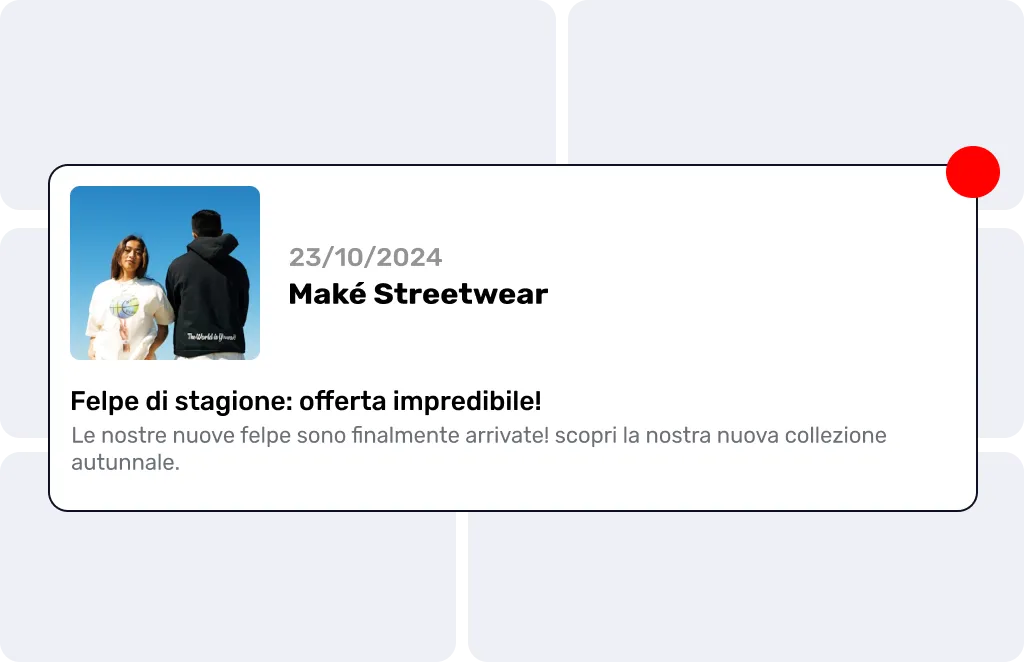 Mantieni aggiornati i tuoi clienti con notifiche push personalizzate e coinvolgenti.